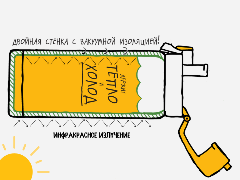 Например, светлая блестящая поверхность термоса будет отражать тепловые лучи из окружающей среды, дополнительно препятствуя нагреванию содержимого.