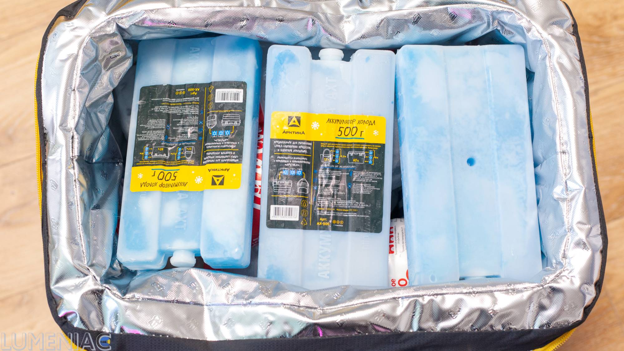 Аккумуляторы холода рассчитывал по «золотому правилу»: 10% от объема, т.е. на сумку в 30 литров понадобилось 6 аккумуляторов по 500 г.