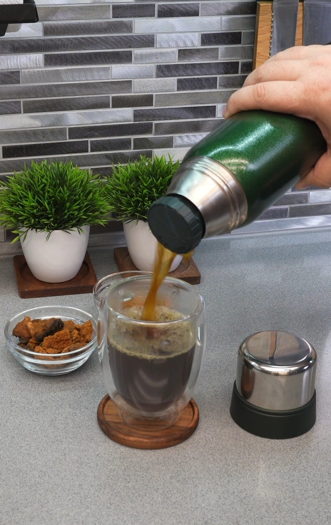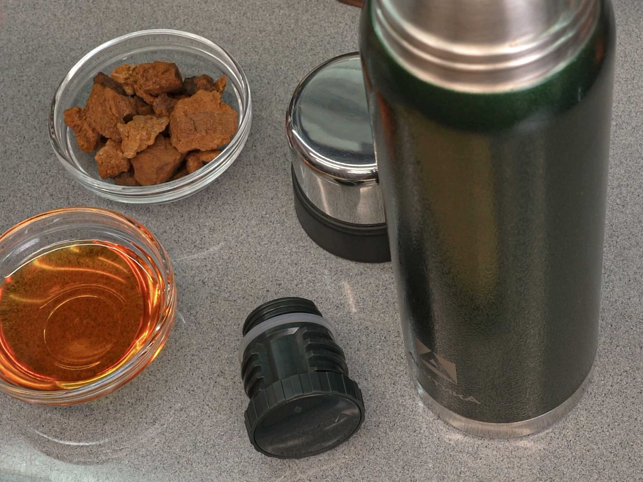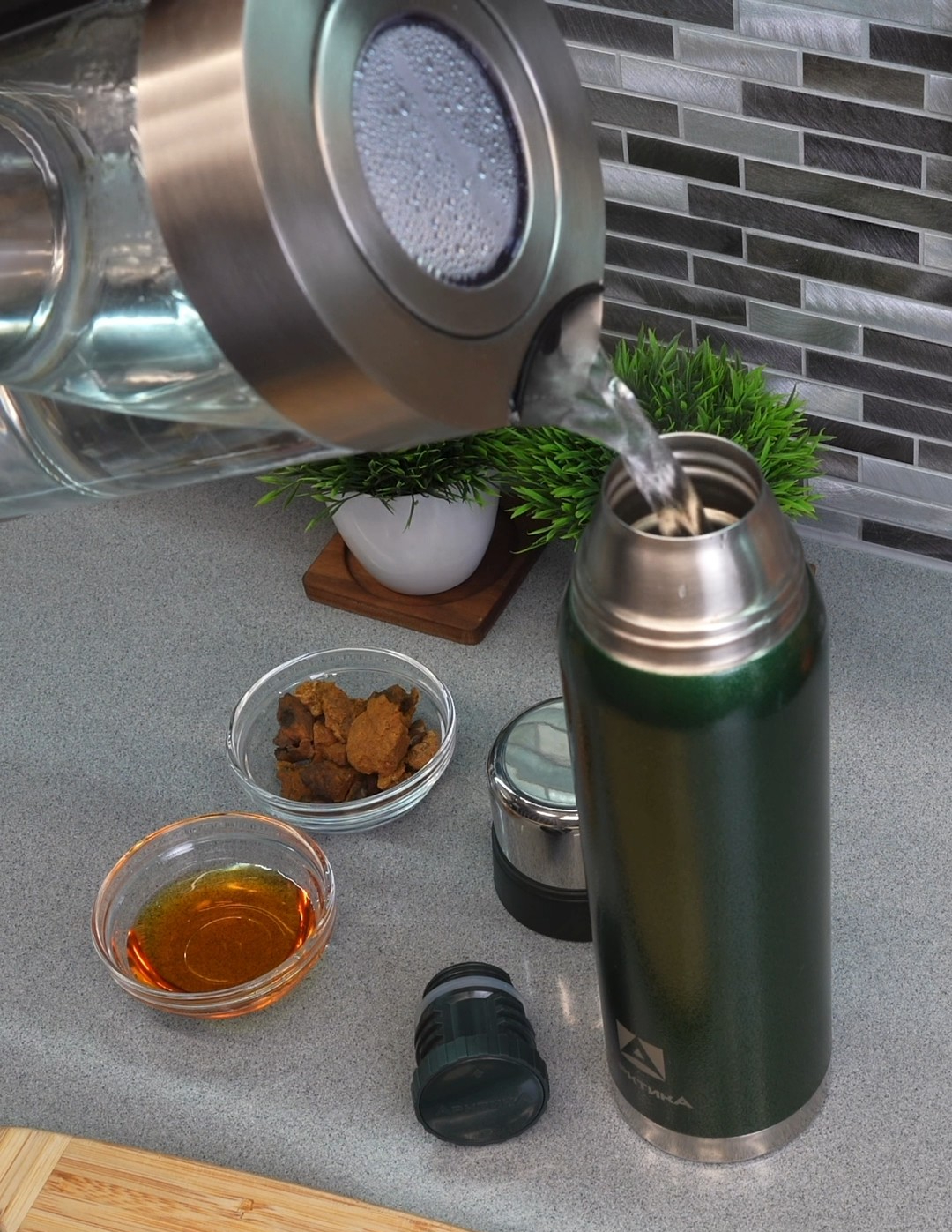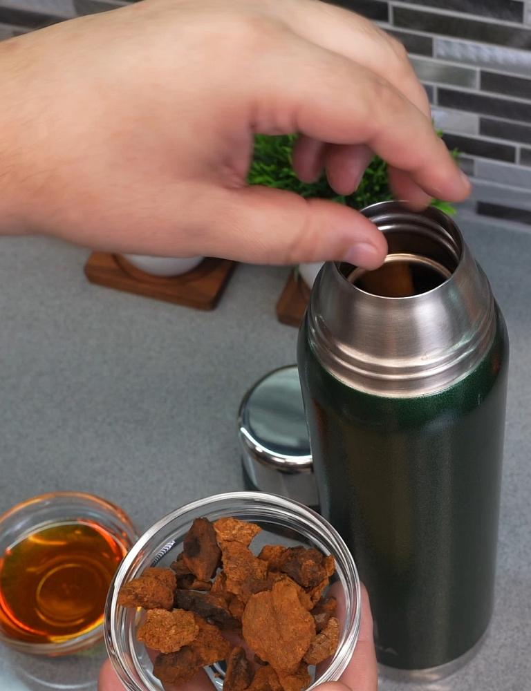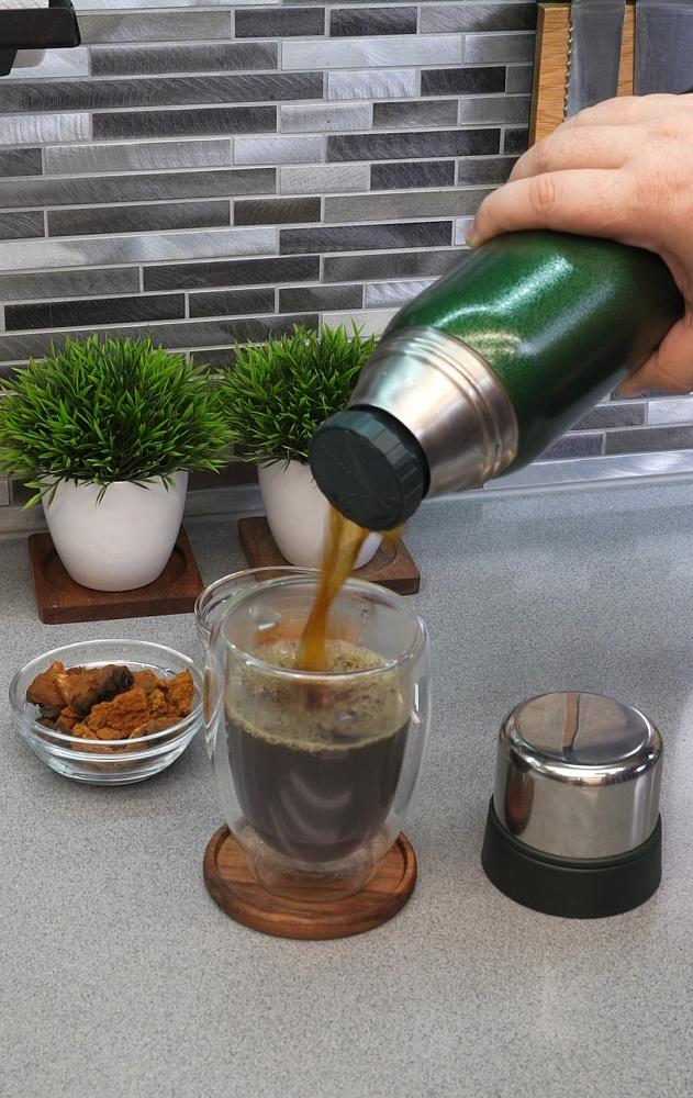 Настаивая чагу в термосе, вы получаете двойную выгоду: во-первых, так напиток лучше настоится, оставаясь при этом горячим. Во-вторых, вы можете сразу взять напиток с собой на прогулку по лесу или заварить его в походных условиях, чтобы согреться в прохладную погоду.