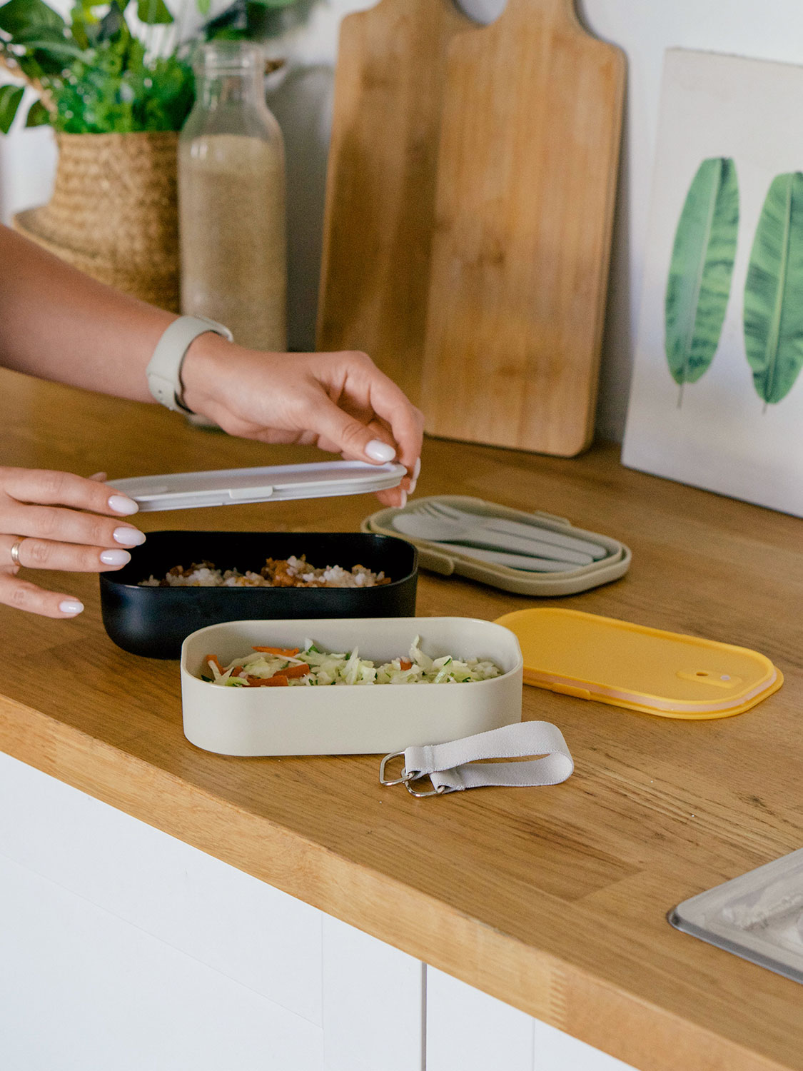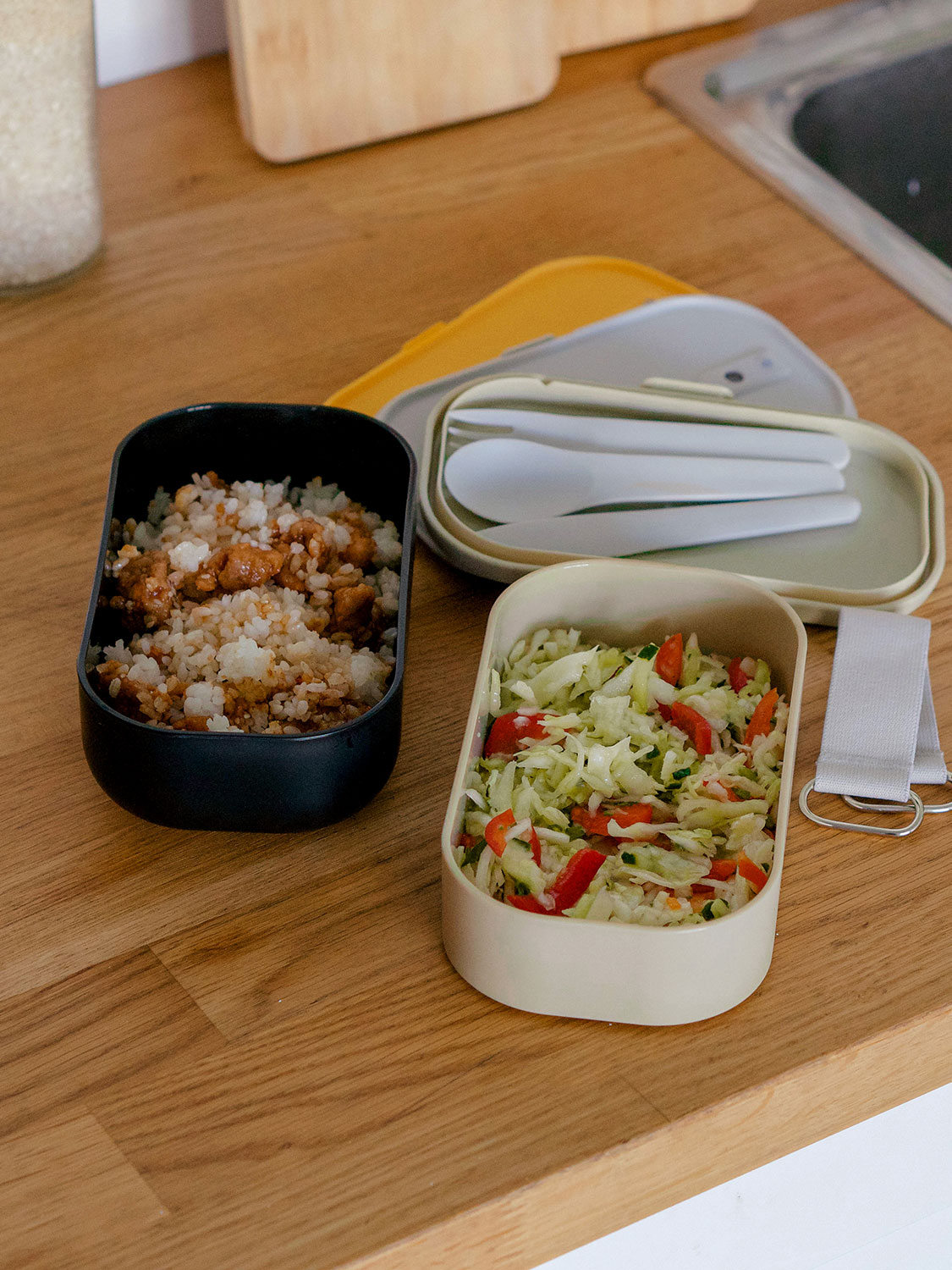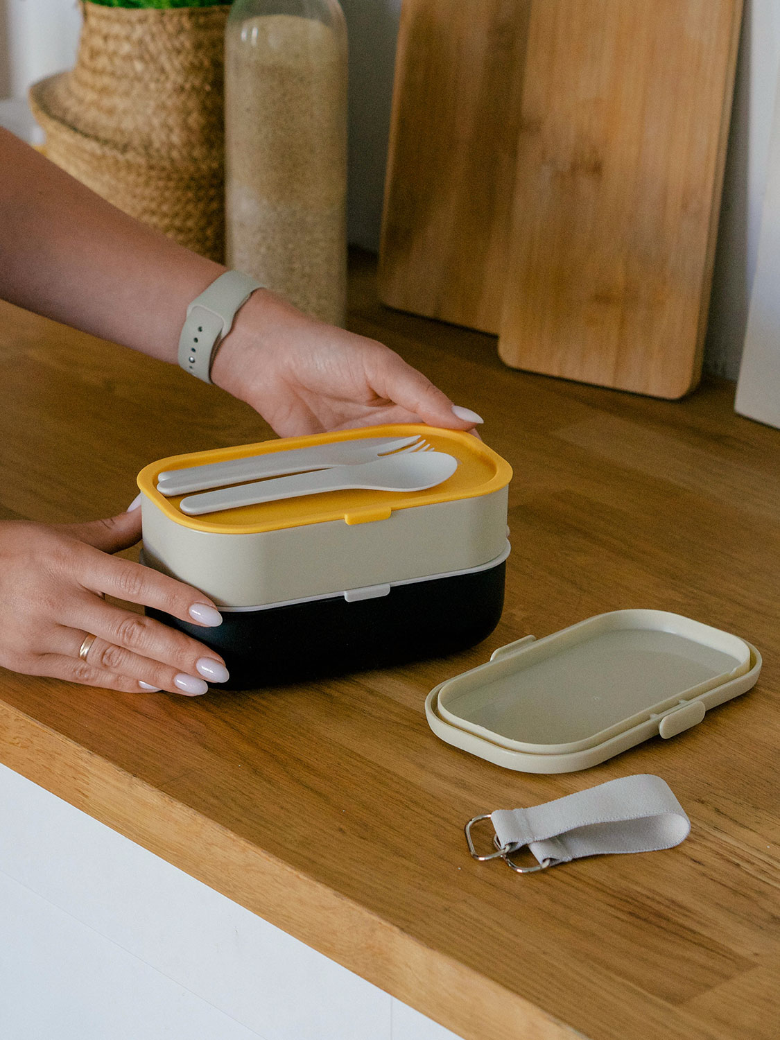 Двухуровневый ланч-бокс с приборами в комплекте упростит задачу, когда нужно взять обед из нескольких блюд и перекусить вне дома. Два отделения на 800 и 550 мл с кейсом для ложки, вилки и ножа позволят не смешивать содержимое и его запах, брать с собой горячие блюда и, например, салат. Их можно использовать и отдельно: например, в качестве детского контейнера или бутербродницы, а также для хранения в холодильнике или морозильной камере.