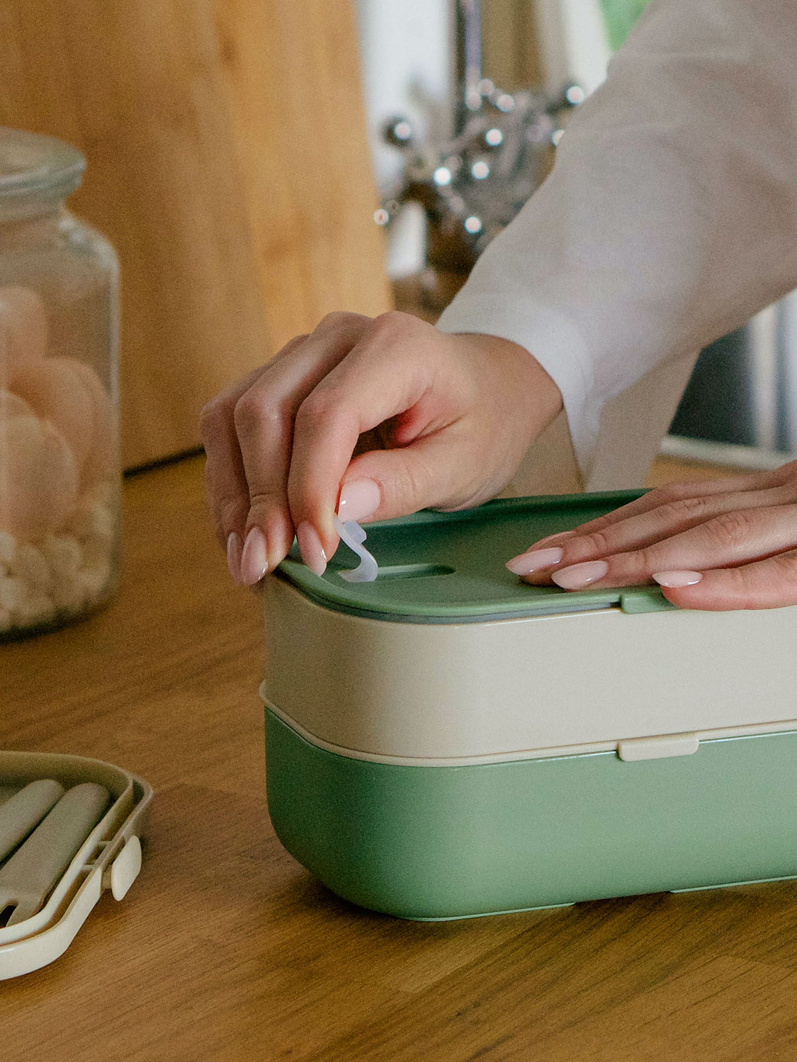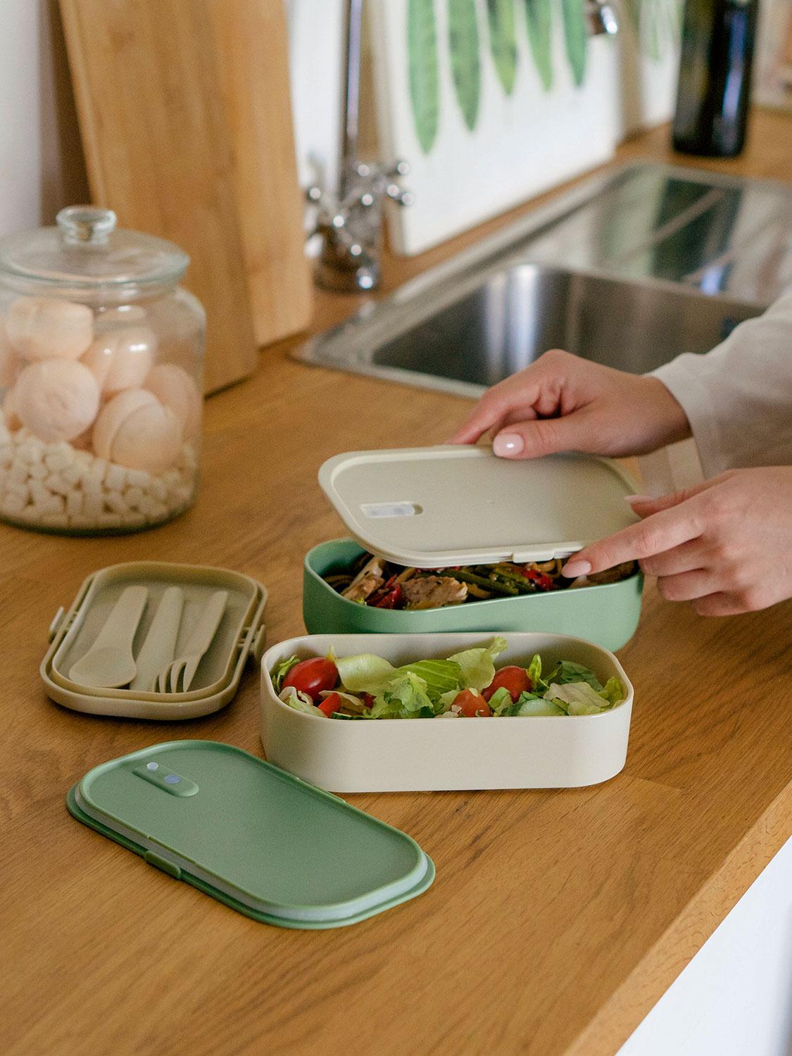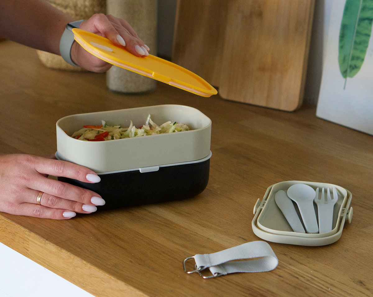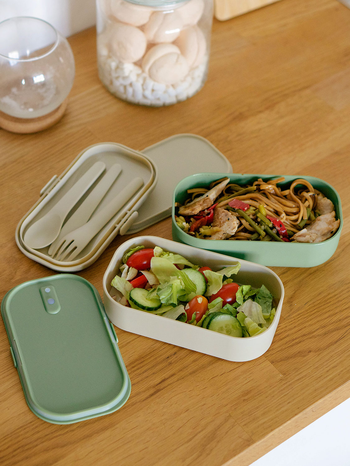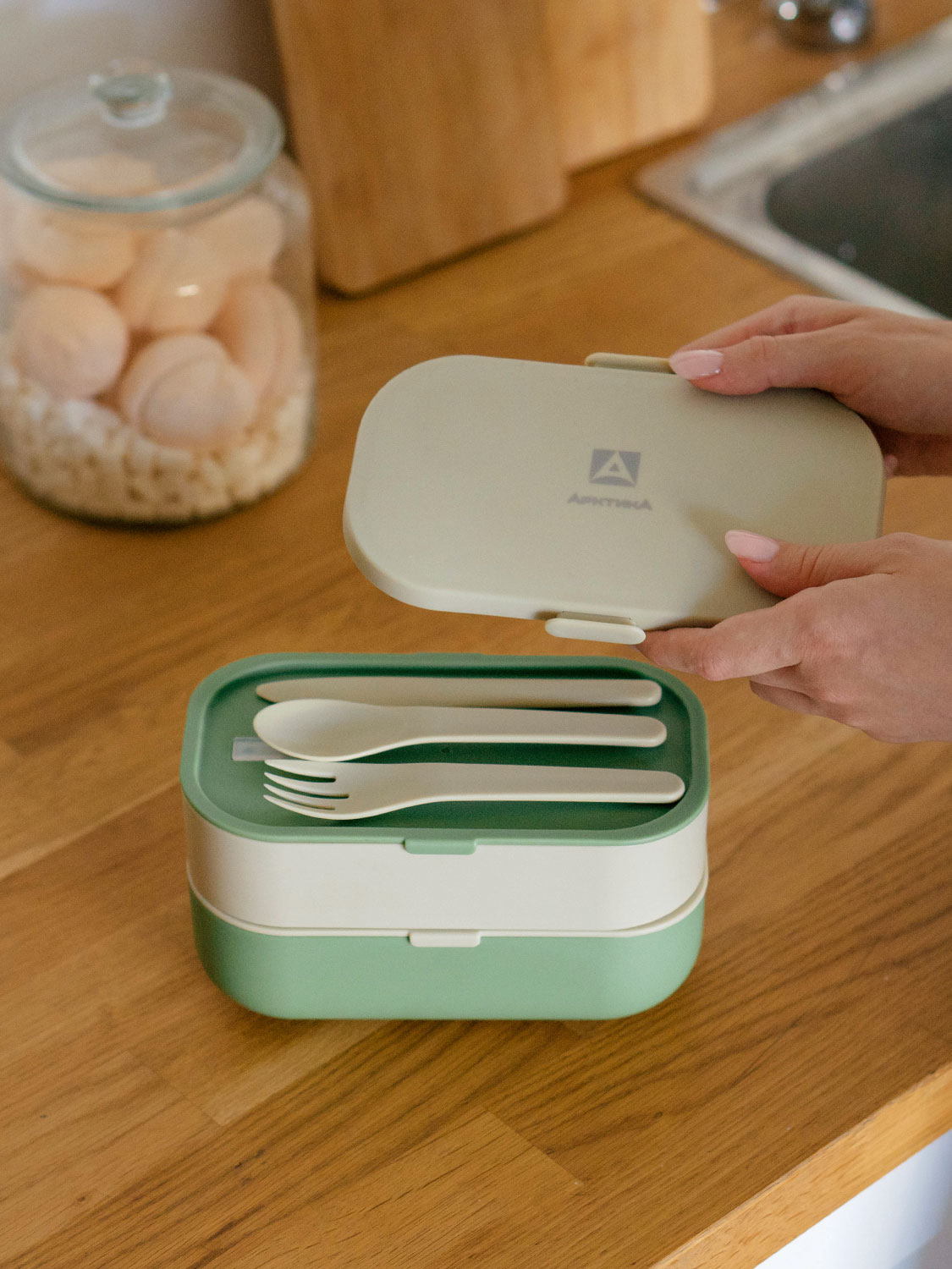 Двухуровневый ланч-бокс с приборами в комплекте упростит задачу, когда нужно взять обед из нескольких блюд и перекусить вне дома. Два отделения на 800 и 550 мл с кейсом для ложки, вилки и ножа позволят не смешивать содержимое и его запах, брать с собой горячие блюда и, например, салат. Их можно использовать и отдельно: например, в качестве детского контейнера или бутербродницы, а также для хранения в холодильнике или морозильной камере.