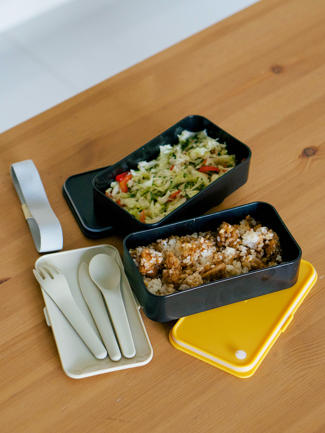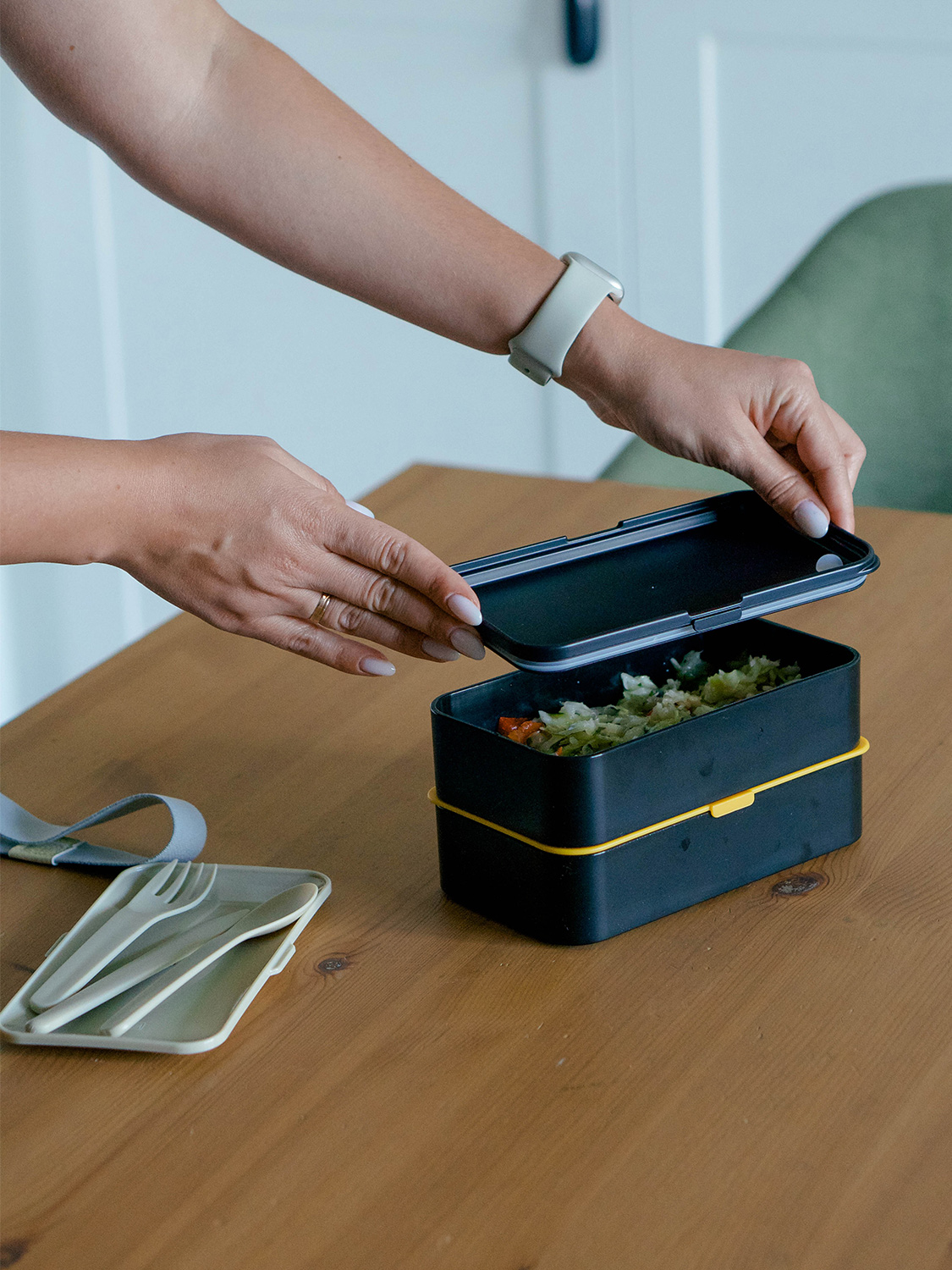 Двухуровневый ланч-бокс с приборами в комплекте упростит задачу, когда нужно взять обед из нескольких блюд и перекусить вне дома. Два отделения по 600 мл с кейсом для ложки, вилки и ножа позволят не смешивать содержимое и его запах, брать с собой горячие блюда и, например, салат. Их можно использовать и отдельно: например, в качестве детского контейнера или бутербродницы, а также для хранения в холодильнике или морозильной камере.
