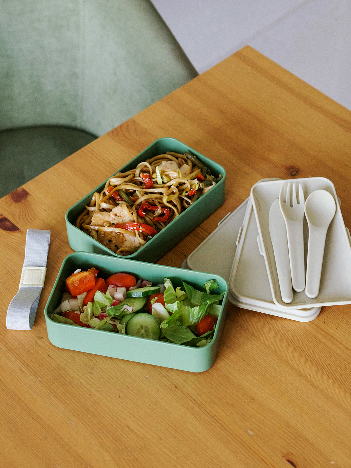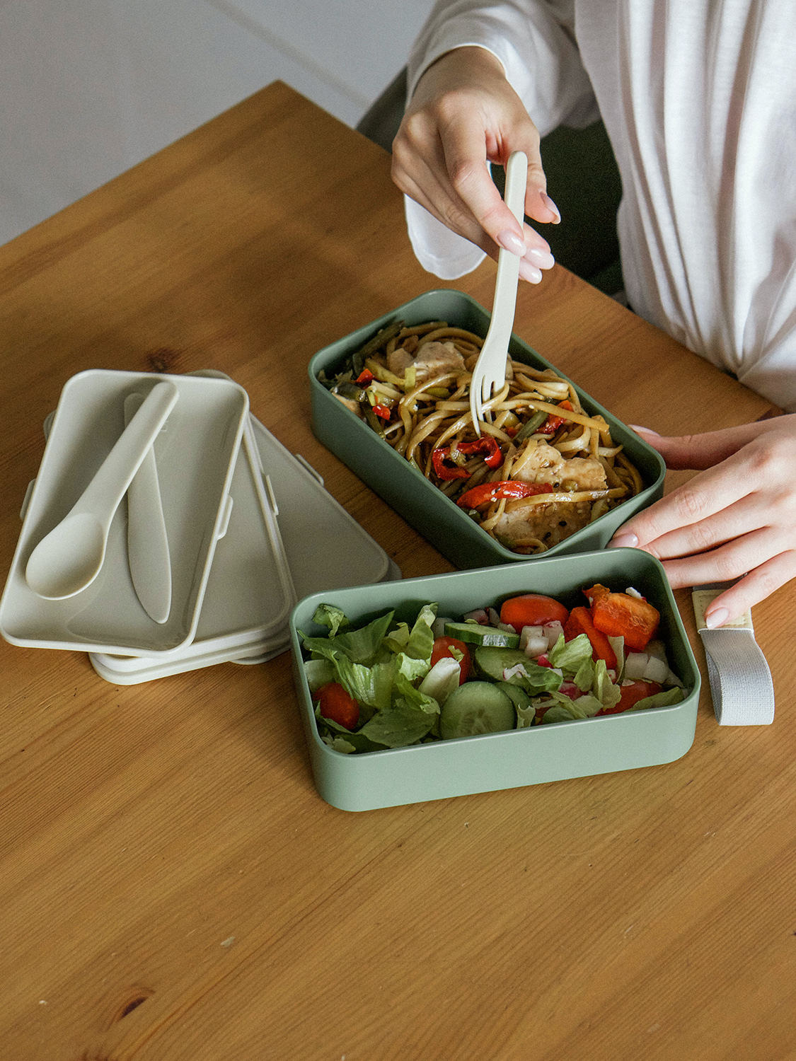 Двухуровневый ланч-бокс с приборами в комплекте упростит задачу, когда нужно взять обед из нескольких блюд и перекусить вне дома. Два отделения по 600 мл с кейсом для ложки, вилки и ножа позволят не смешивать содержимое и его запах, брать с собой горячие блюда и, например, салат. Их можно использовать и отдельно: например, в качестве детского контейнера или бутербродницы, а также для хранения в холодильнике или морозильной камере.
