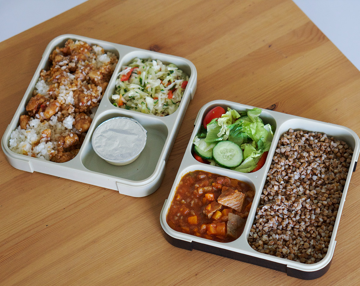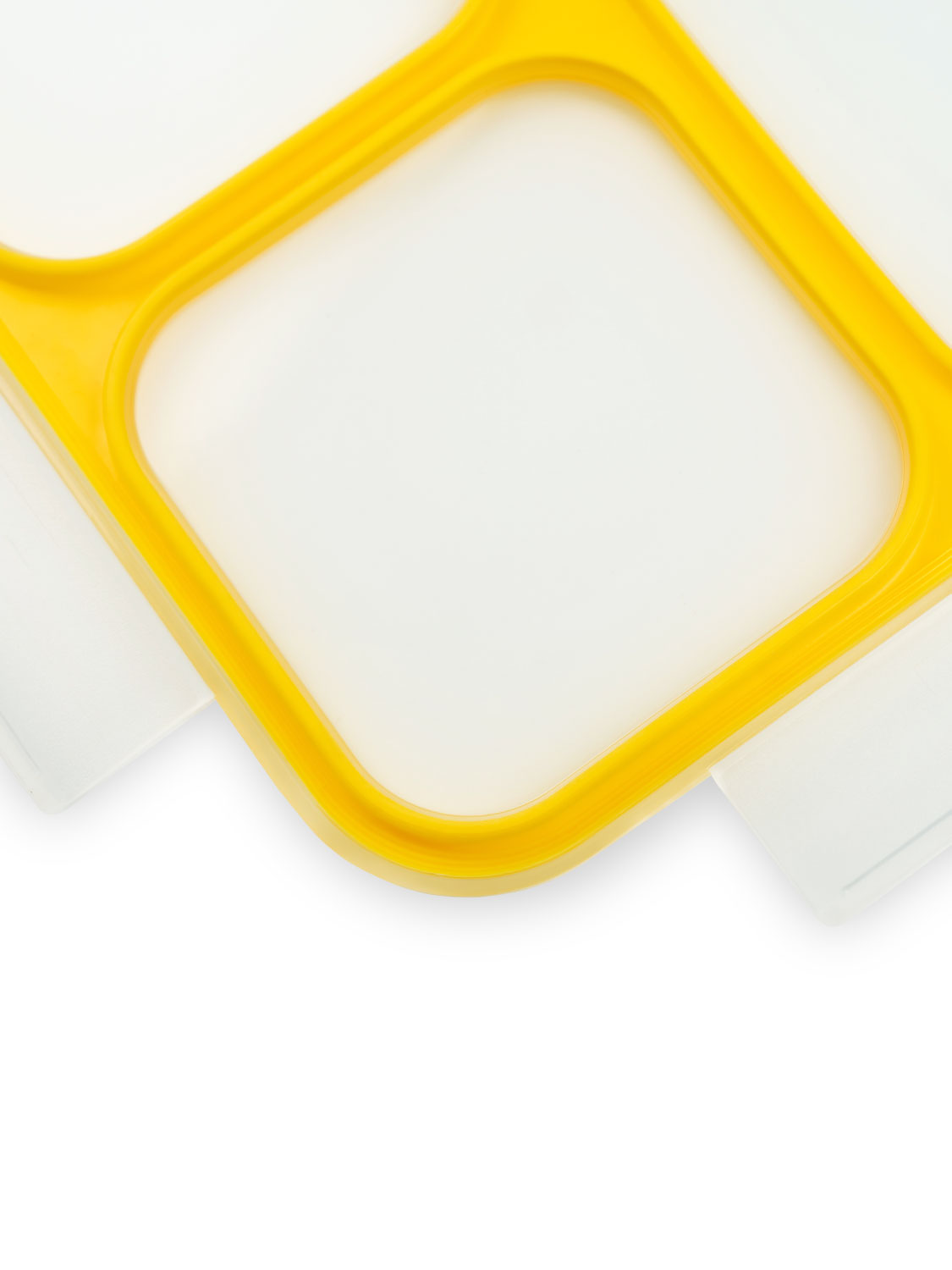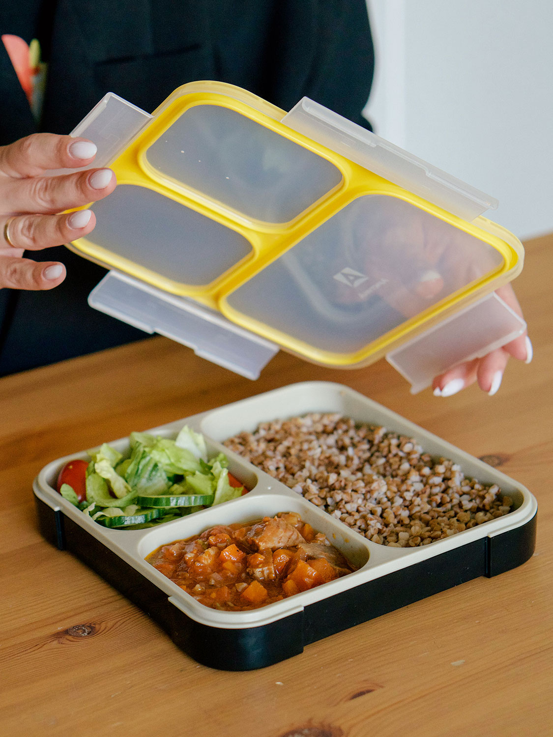 Плоский ланч-бокс на защелках с тремя отсеками — это новый подход к обеду или перекусу вне дома. Вы можете носить его в рюкзаке или сумке вертикально, как книгу или ноутбук, и всегда найдете место в холодильнике! Замените три контейнера на один: ваш гарнир, мясо или рыба с соусом и салат не перемешаются между собой. За герметичность отвечают силиконовая прослойка по всему периметру и защищенные от случайного открывания защелки.