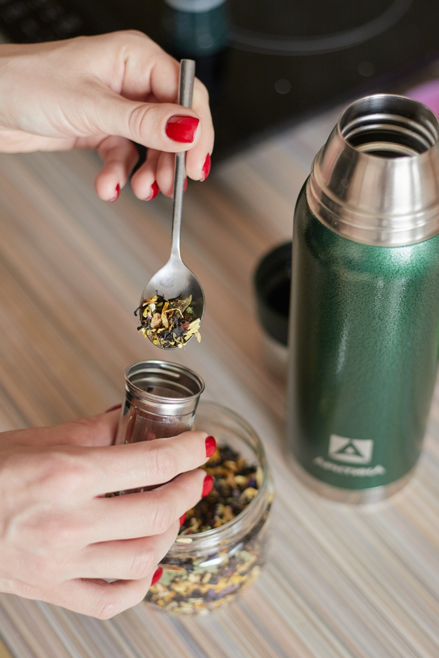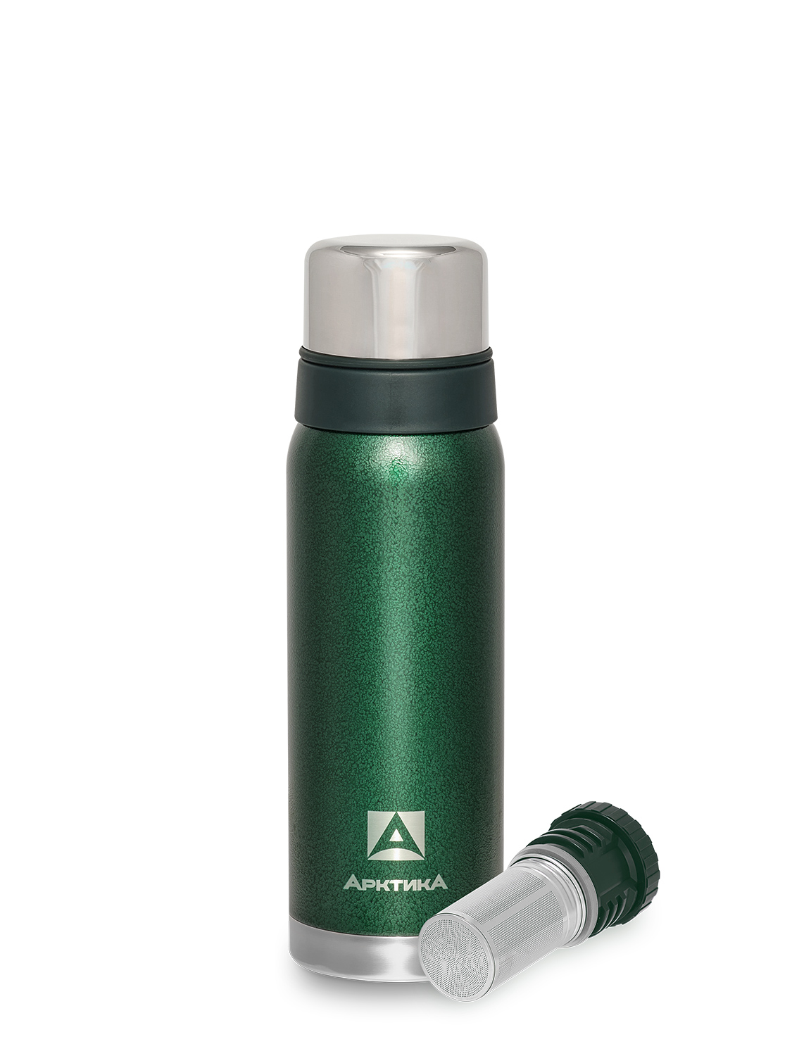 Термос серии 106 на 0.75л зелёный с ситечком и молотковой эмалью
