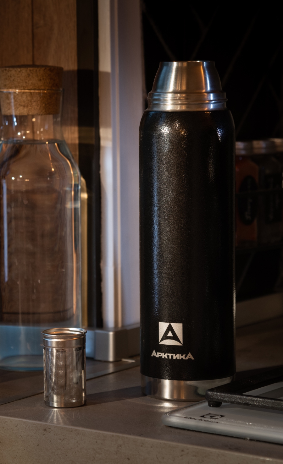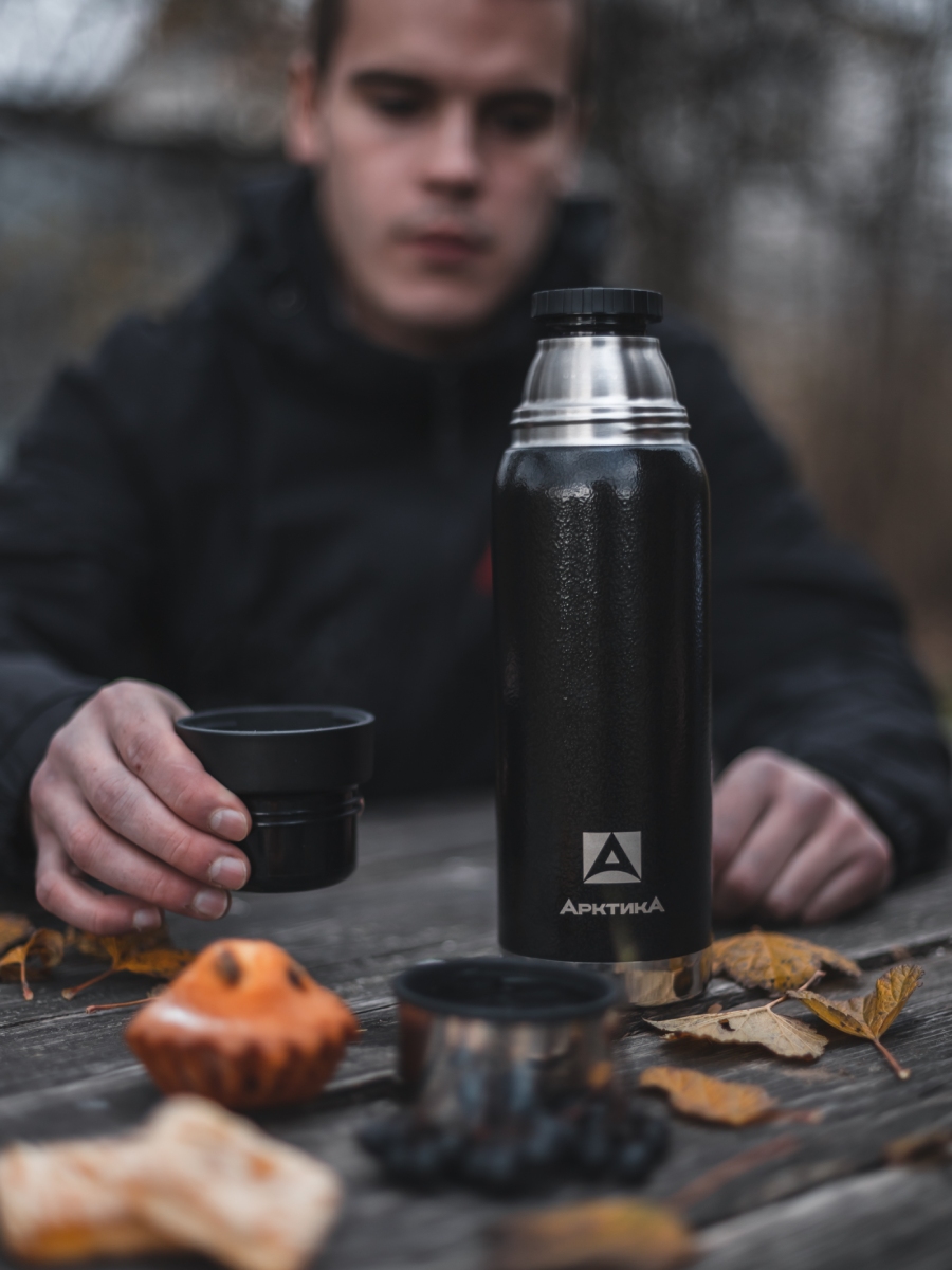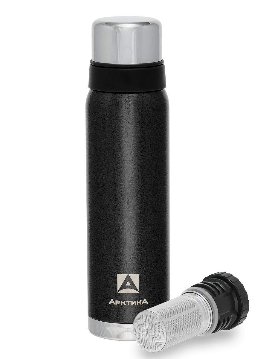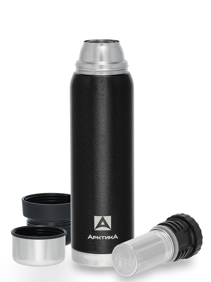 Термос 0.9л серии 106 чёрный с ситечком и молотковой эмалью