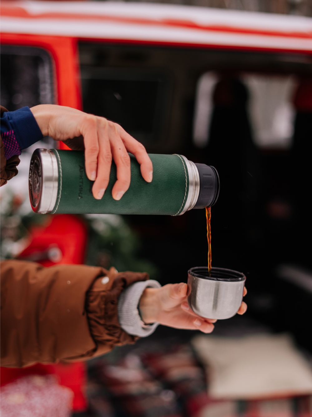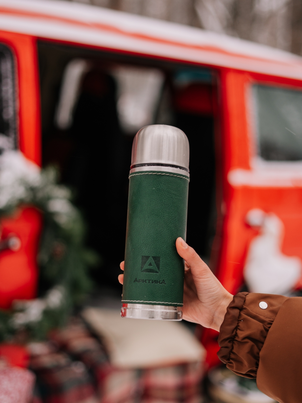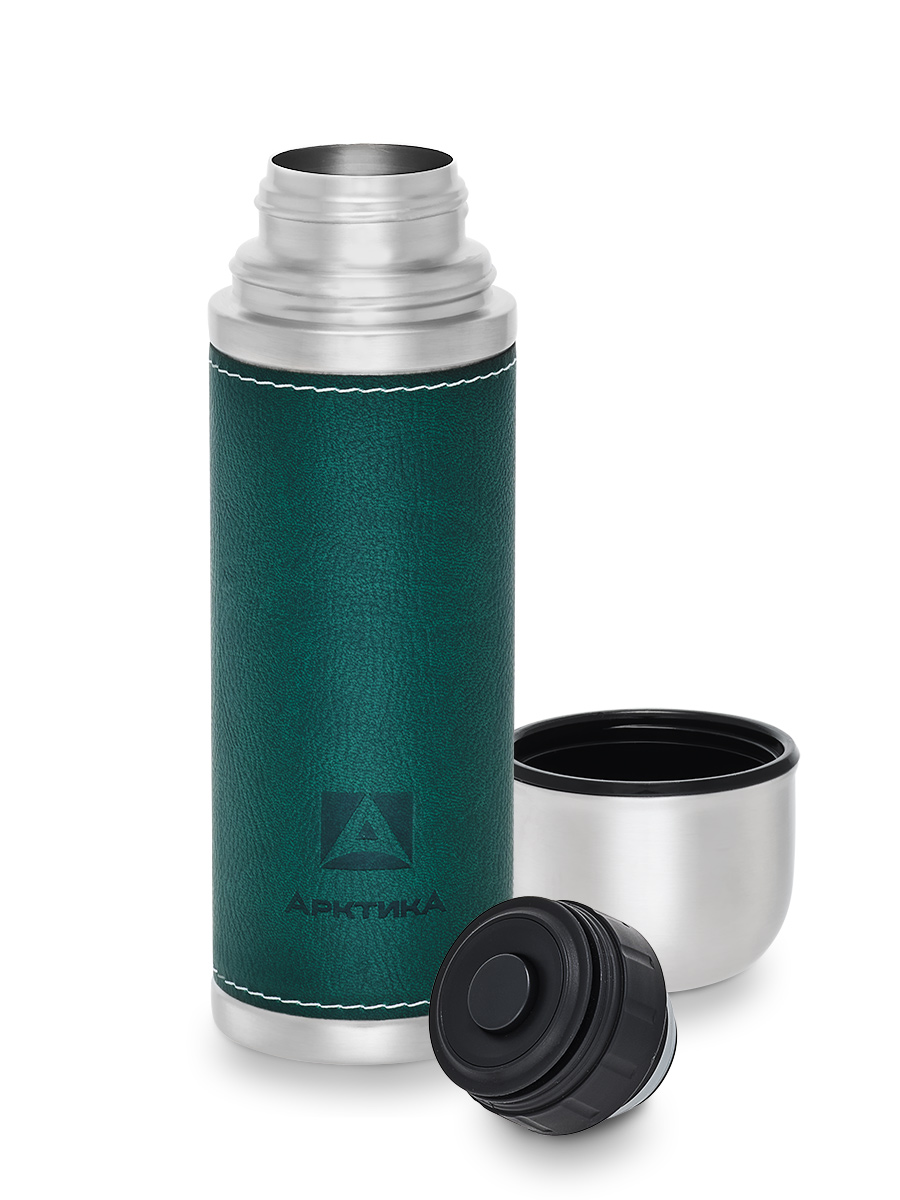 Термос 0.5л серии 108 с зелёной оплёткой из экокожи