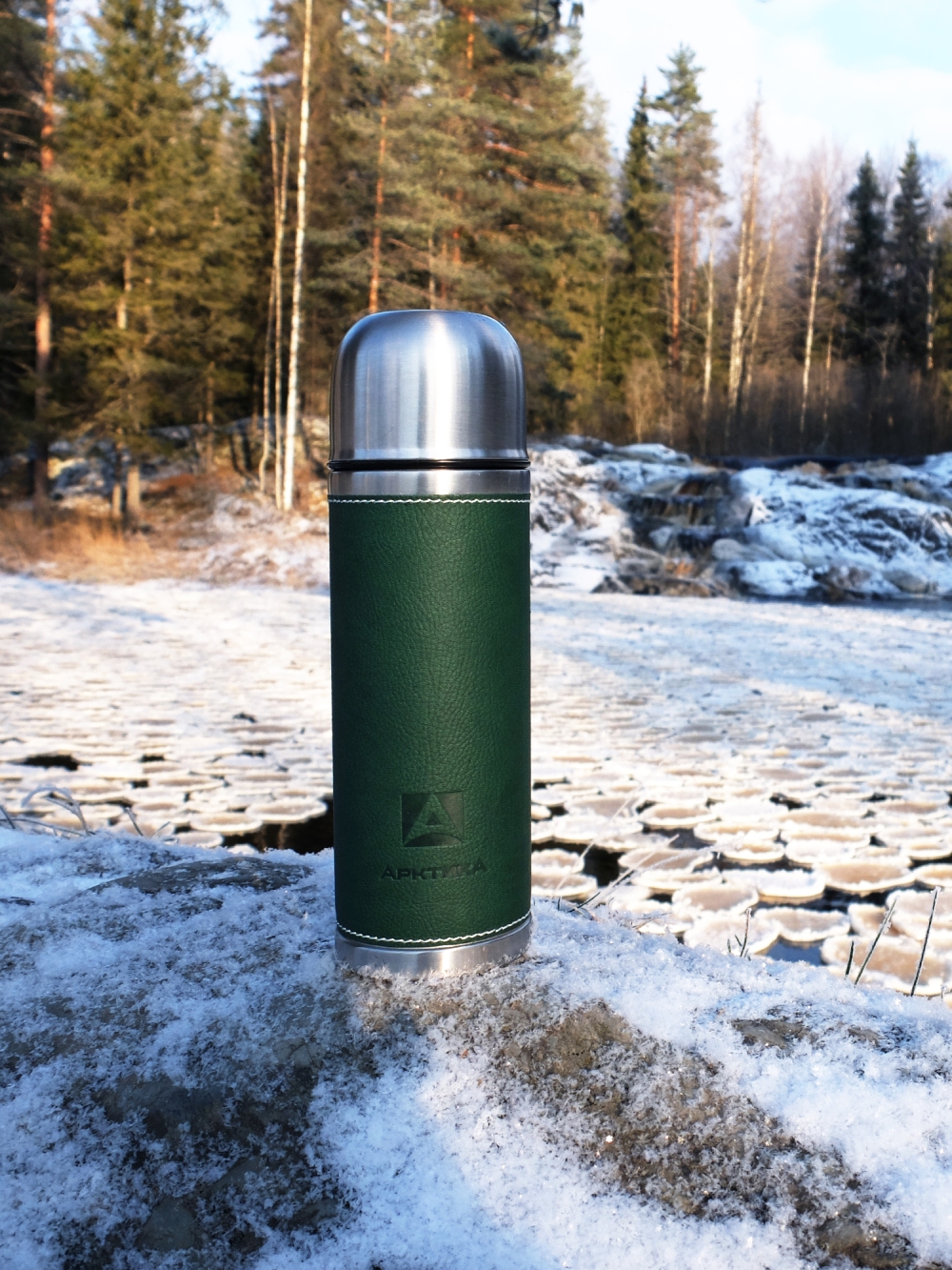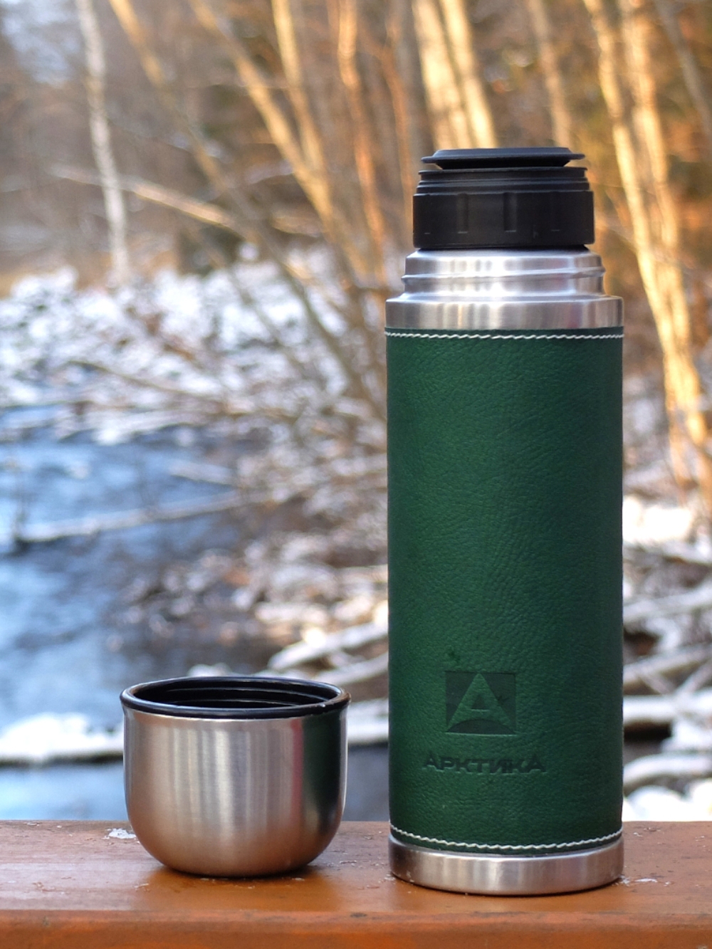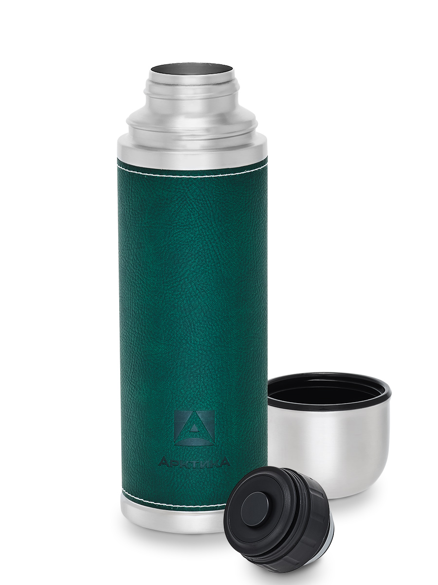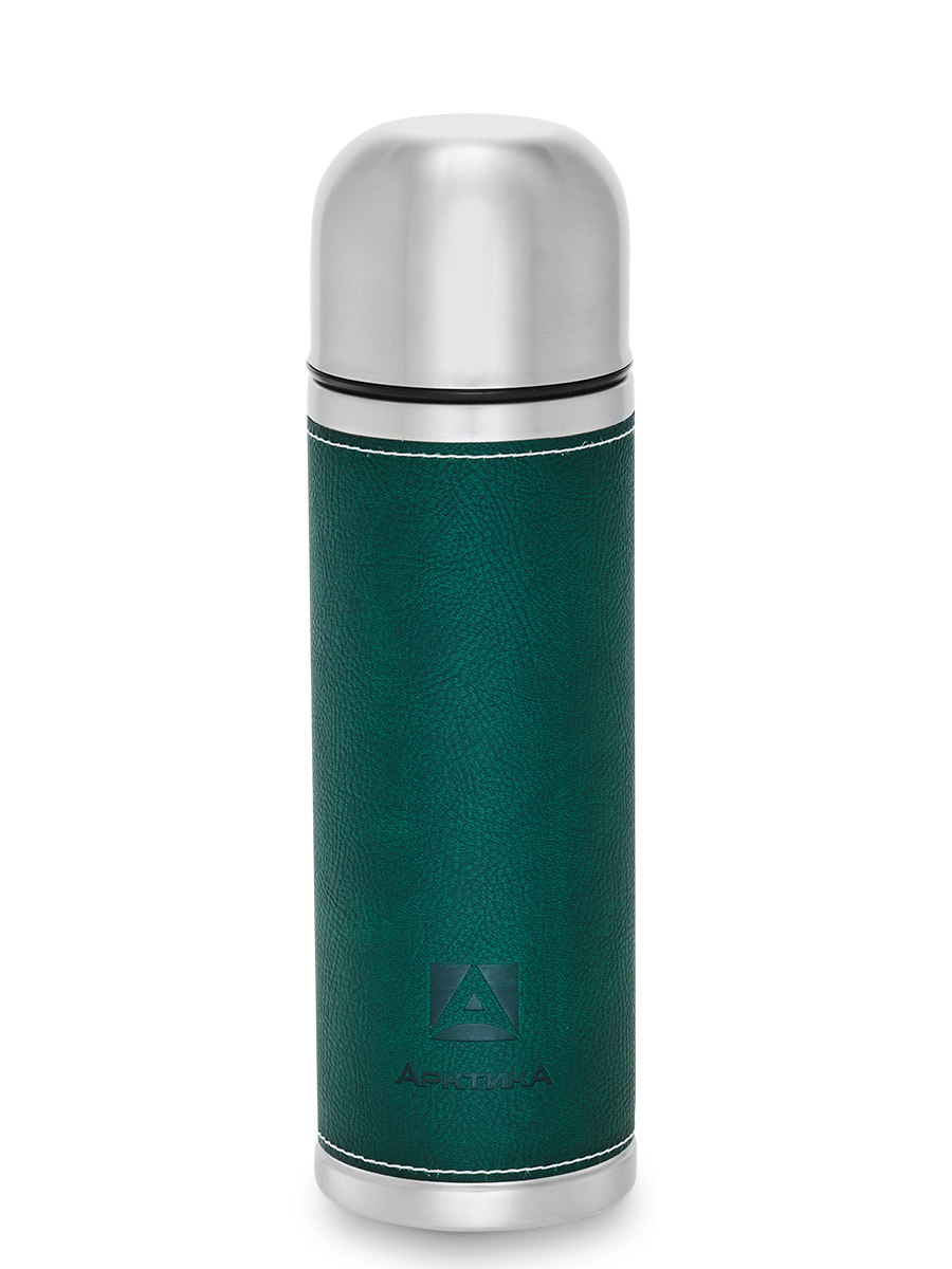 Термос 0.7л серии 108 с зелёной оплёткой из экокожи