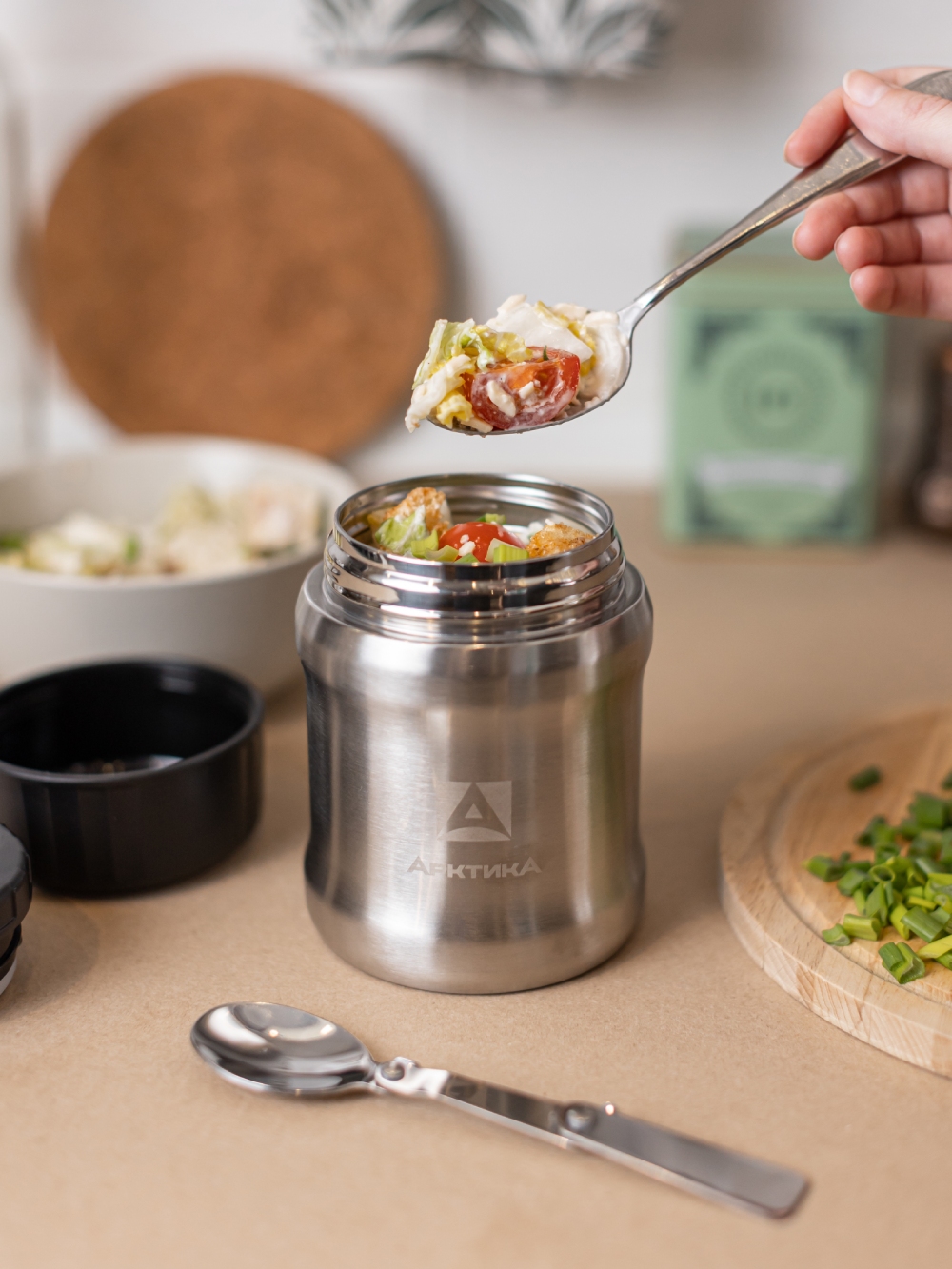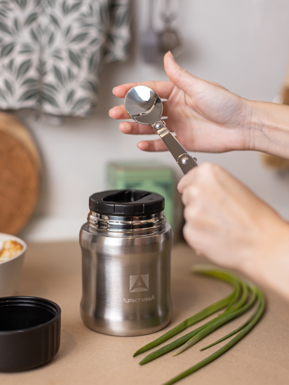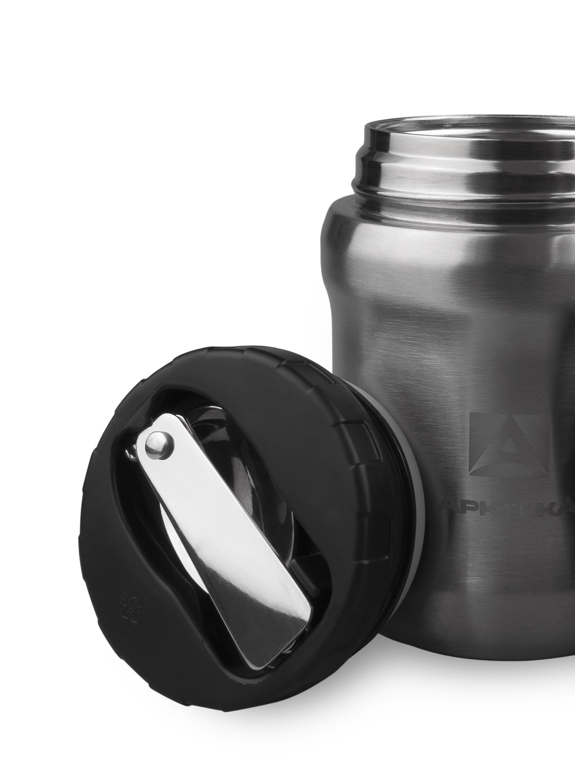 Ешьте там, где вам удобно и не беспокойтесь о приборах – складная ложка уже в комплекте и крепится к пробке. Благодаря широкому горлу можно есть прямо из термоса. Также можно переложить еду в крышку-чашку, полностью выполненную из пластика, и при необходимости даже разогреть ее в микроволновой печи. Кнопка для стравливания воздуха предотвратит присасывание, а сужение по бокам позволит комфортно удерживать термос в одной руке.