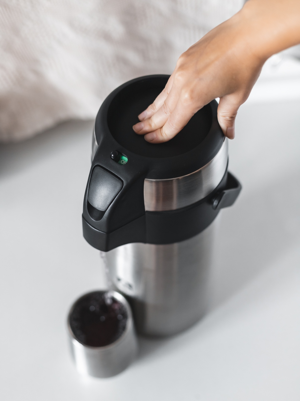 Этот вакуумный настольный термос не только поможет удержать нужную температуру напитка, но и сам нальет его в кружку всего в несколько нажатий. Чтобы помпа не засорилась, рекомендуем заполнять термос только процеженным напитком без примесей и ягод. Термос пригодится в качестве источника горячей воды на весь день, освежит в жару прохладной водой или лимонадом, поможет сэкономить расход электричества и обеспечит согревающим напитком вдали от розеток.