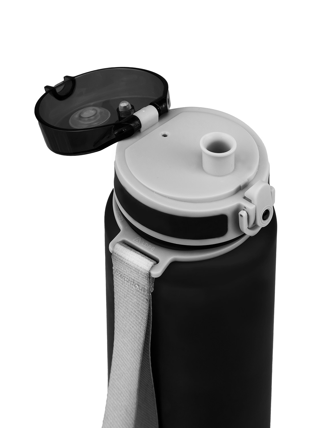 Носик бутылки надежно защищен откидной крышкой от любых загрязнений, а замок с фиксатором предотвращает случайное открывание. Бутылку можно легко открыть одной рукой и пить любимый напиток на ходу благодаря кнопке и удобному носику. Текстильный ремешок освободит руки при переноске бутылки, а ситечко-фильтр позволит пить охлажденный компот, оставляя остатки ягод и фруктов внутри.