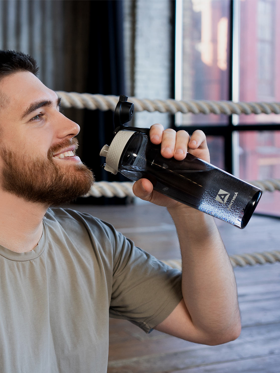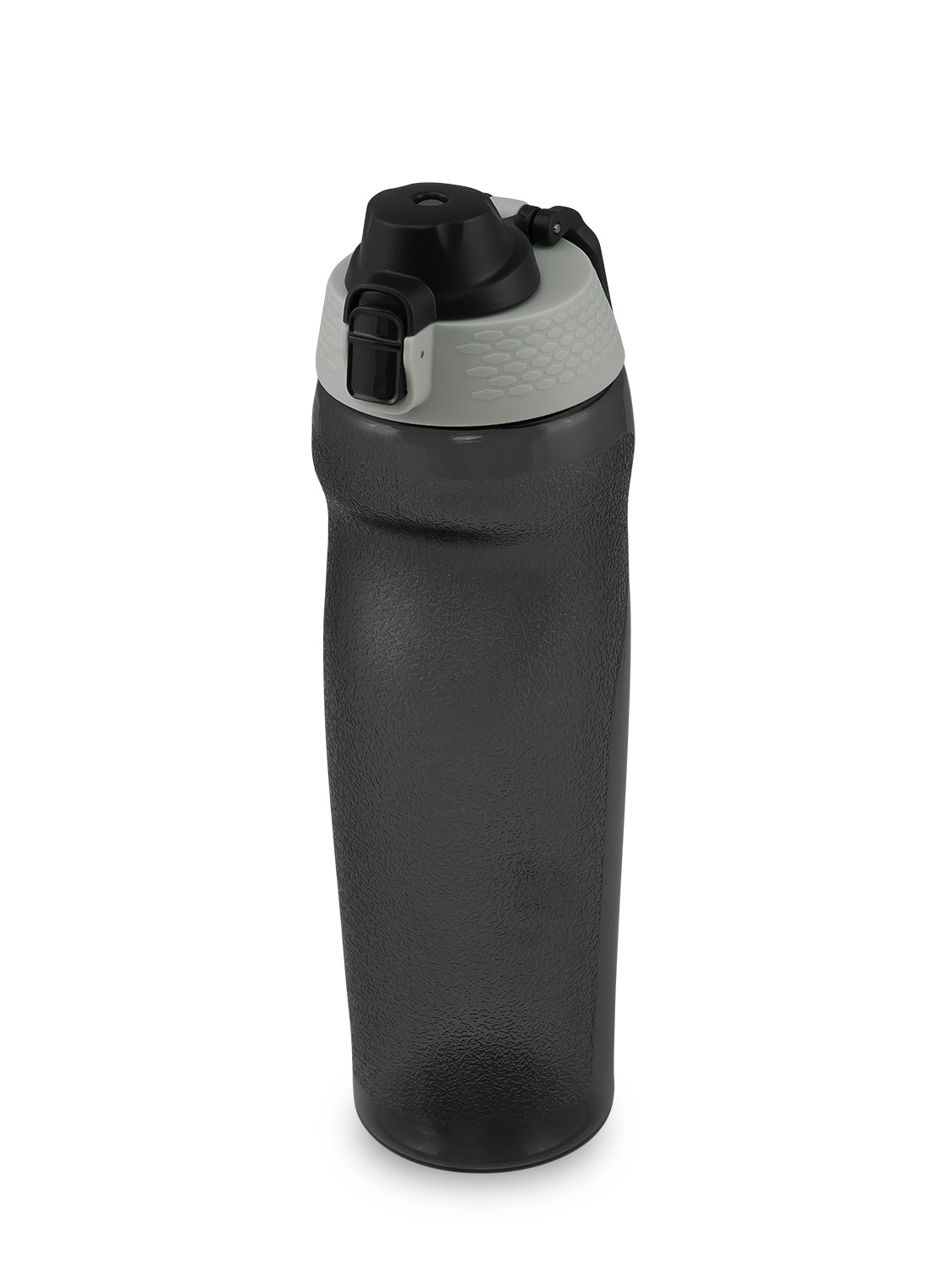 Особая форма и специальное покрытие бутылки не даст ей выскользнуть даже из вспотевших ладоней. Подходит для большинства подстаканников и держателей на тренажерах, беговых дорожках и велосипедах. Ее также можно переносить за петлю или закрепить карабином. Бутылка надежно защищена от случайного открывания кнопкой с фиксатором, и при этом легко открывается одной рукой. Более широкий, чем у повседневных бутылок из тритана, питьевой носик, а также отверстия для выхода воздуха не дают воде расплескаться даже при сильном и резком наклоне бутылки.