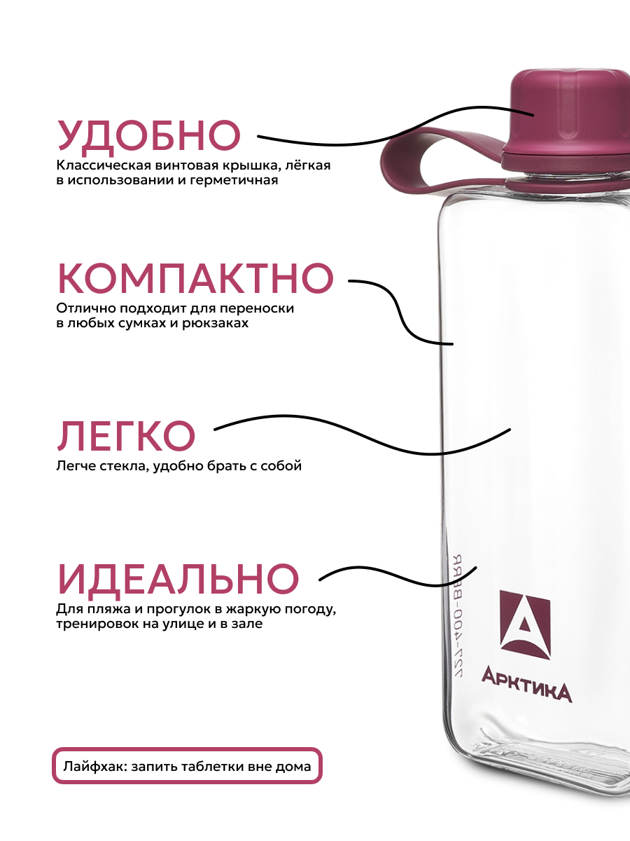 Tritan™ — современная альтернатива обычному пластику и стеклу, который сочетает в себе лучшие их качества. Корпус у бутылки прочный, износостойкий и легкий, как пластик, но прозрачный и безопасный для здоровья, как стекло. Еще она «переживет» падение с высоты человеческого роста, не боится кипятка до 90°С и остаётся прозрачной даже после активного использования.