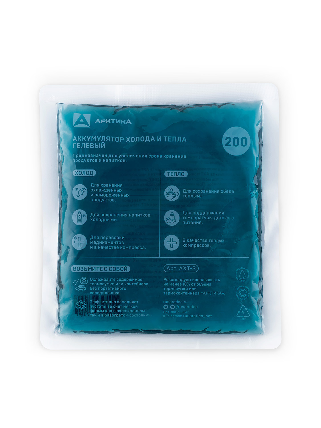 Мягкий аккумулятор холода и тепла – находка для термосумок небольших объемов. Легкий, не занимает много места, принимает нужную форму и эффективно занимает пространство внутри термосумки. Выручит при переноске ланча и обеда на работу, готовых блюд, свежих и скоропортящихся продуктов, медикаментов и деликатесов, которым нужен определенный температурный режим. Кроме того, может использоваться как холодный и теплый компресс.
