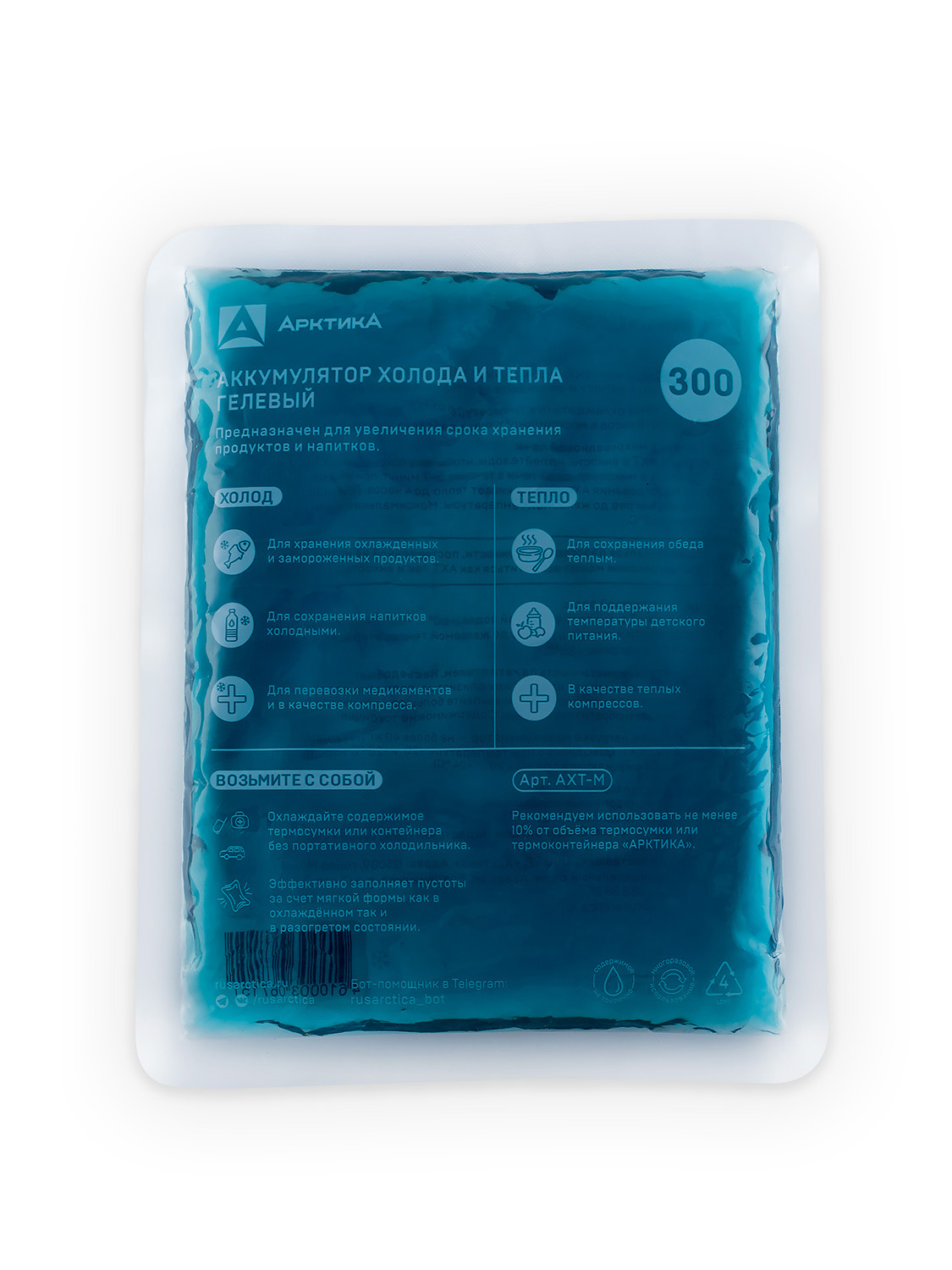 Мягкий аккумулятор холода и тепла – находка для термосумок небольших объемов. Легкий, не занимает много места, принимает нужную форму и эффективно занимает пространство внутри термосумки. Выручит при переноске ланча и обеда на работу, готовых блюд, свежих и скоропортящихся продуктов, медикаментов и деликатесов, которым нужен определенный температурный режим. Кроме того, может использоваться как холодный и теплый компресс.
