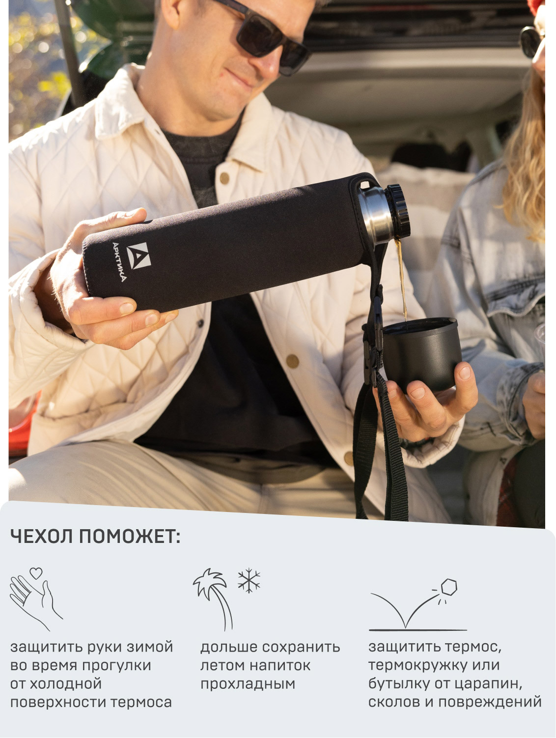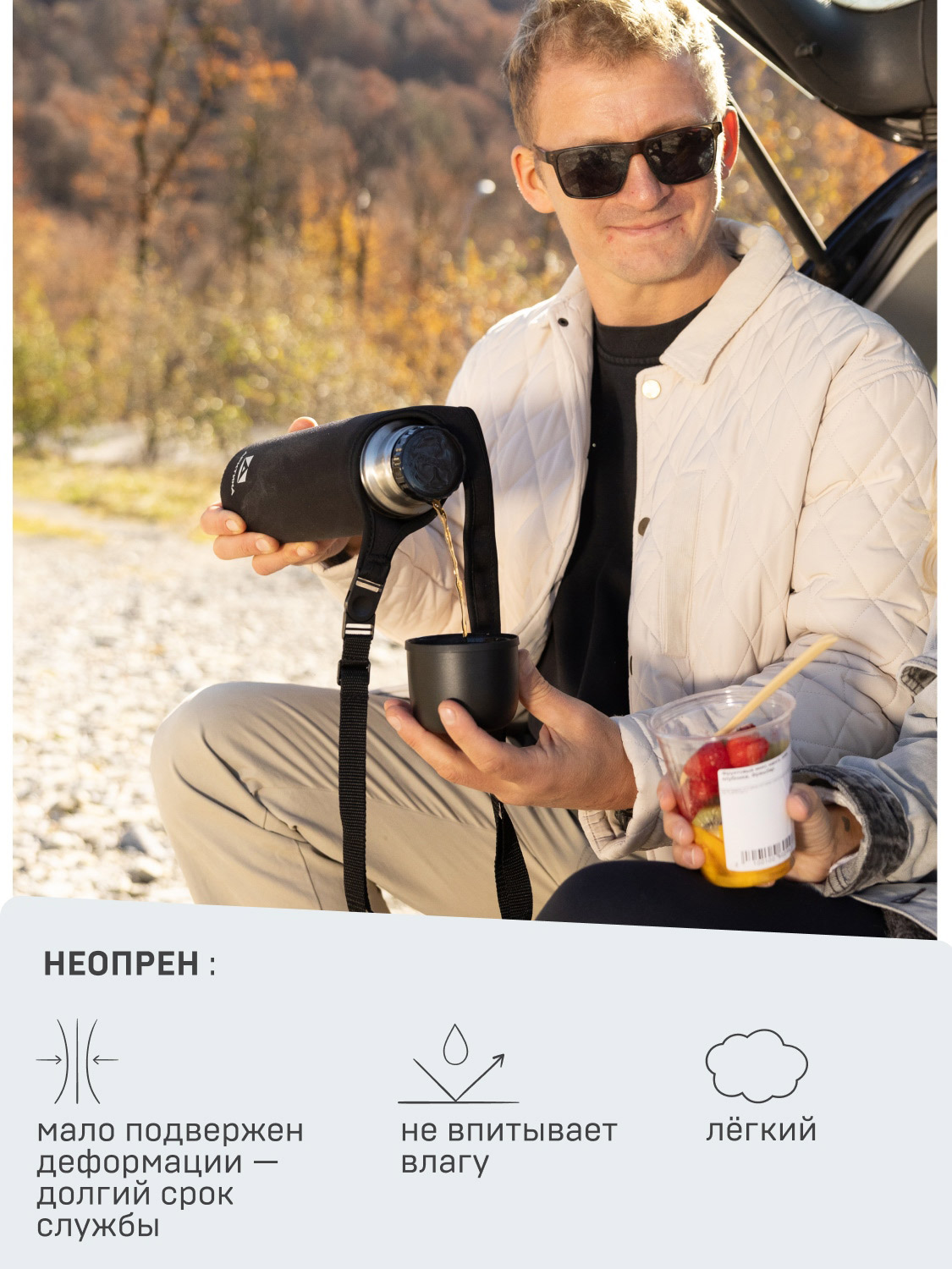Неопрен — это прочный и эластичный материал, который не боится времени и капризов погоды. Он легкий и не впитывает влагу, устойчив к морозам, каплям дождя и долгой носке в любое время года. Зимой защитит руки от холодной поверхности термоса, летом дольше сохранит напиток прохладным. А еще будет кстати во время приключений и активного отдыха — пригодится от царапин и сколов.