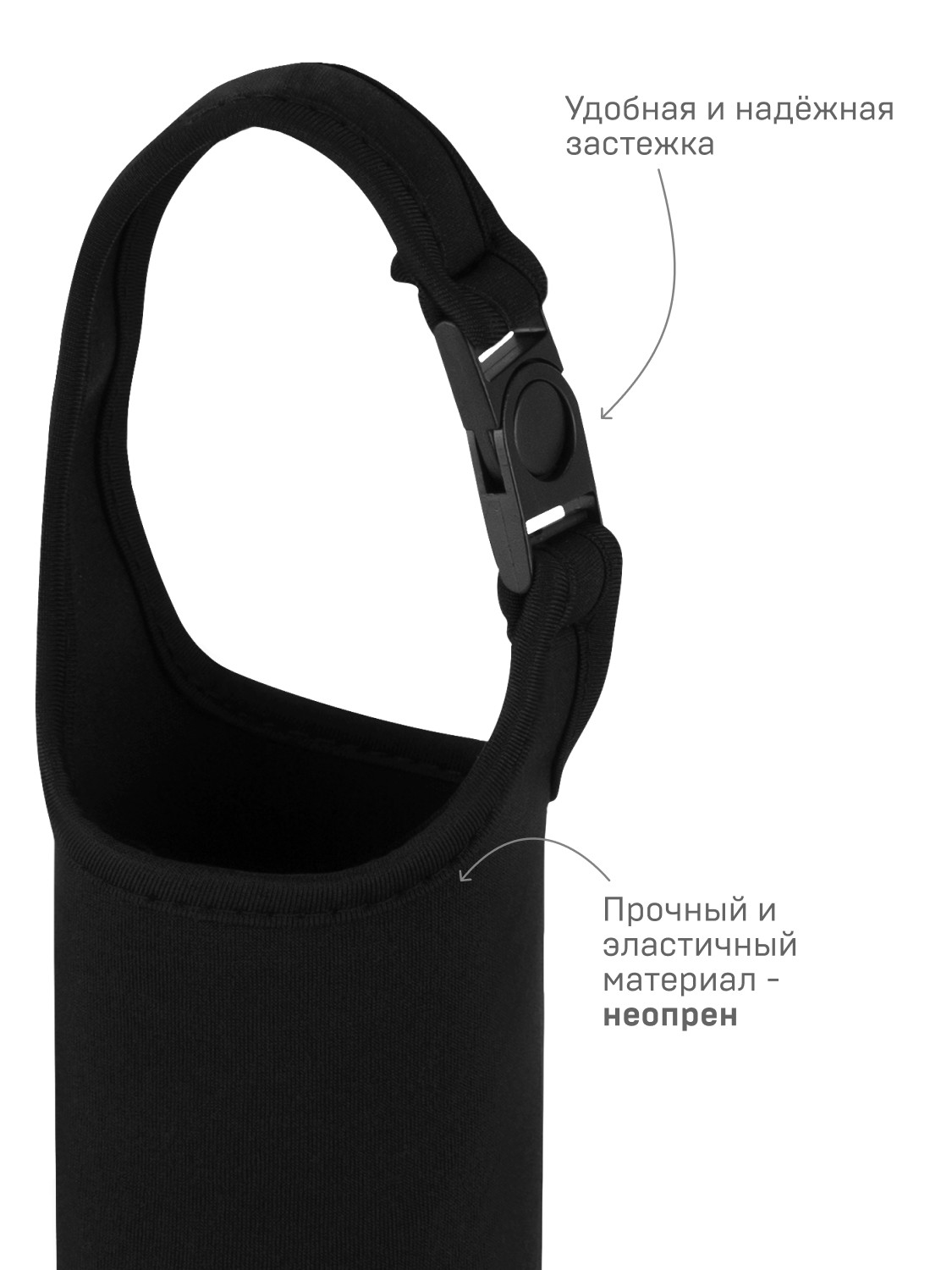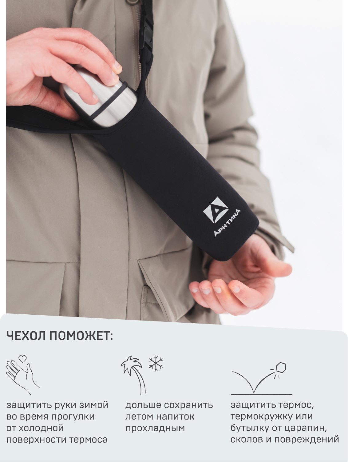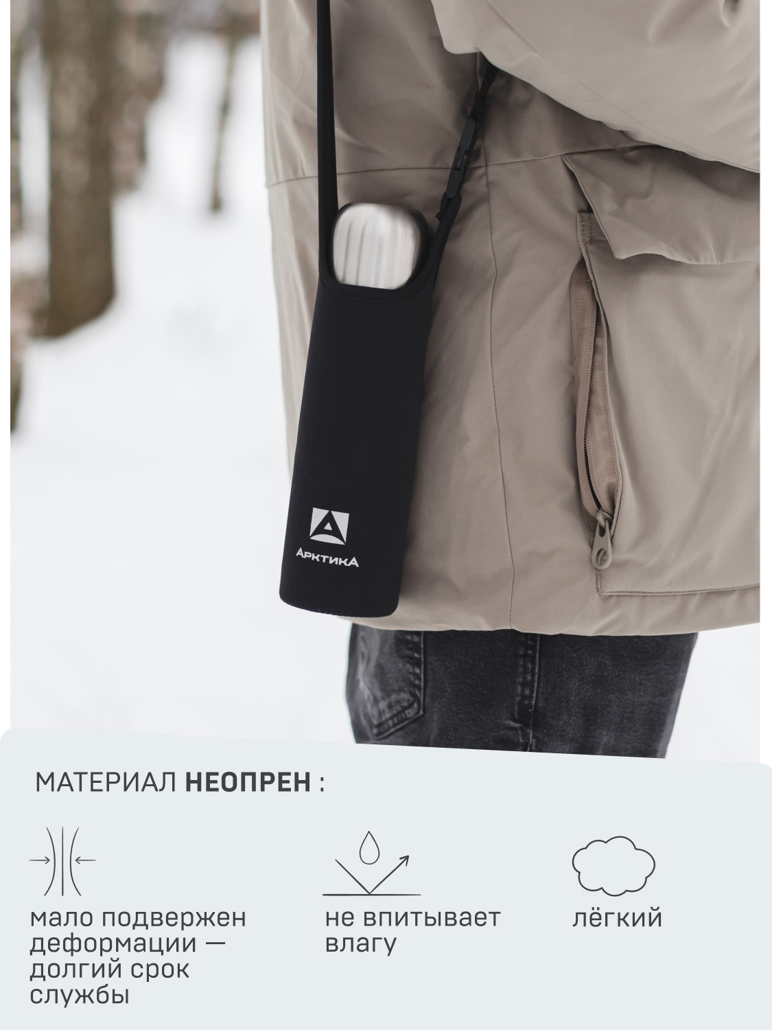 Неопрен — это прочный и эластичный материал, который не боится времени и капризов погоды. Он легкий и не впитывает влагу, устойчив к морозам, каплям дождя и долгой носке в любое время года. Зимой защитит руки от холодной поверхности термоса, летом дольше сохранит напиток прохладным. А еще будет кстати во время приключений и активного отдыха — пригодится от царапин и сколов.